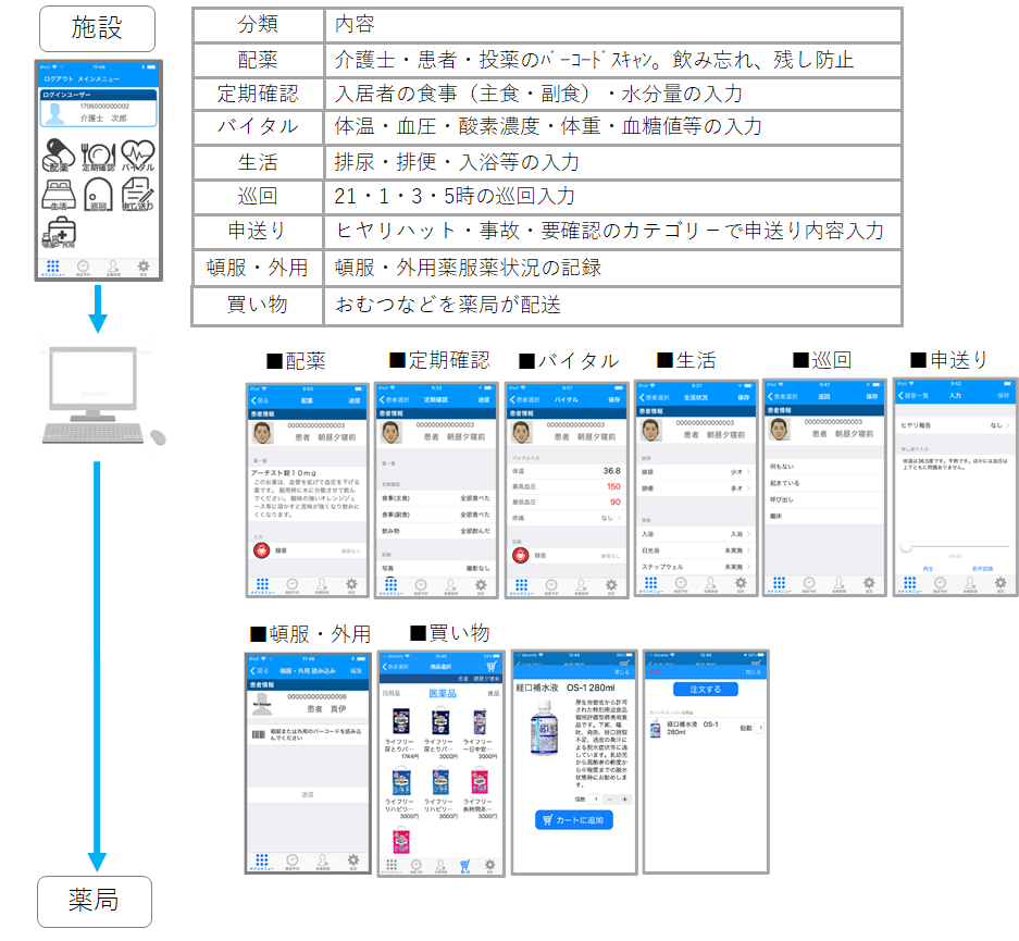 また、介護施設の情報は、「お薬カレンダー」を作成、配達した薬局と連携をとり、「飲み忘れ」「飲み間違い」などがあった場合でも、薬局と速やかに連携し、対応できます。